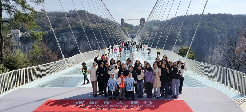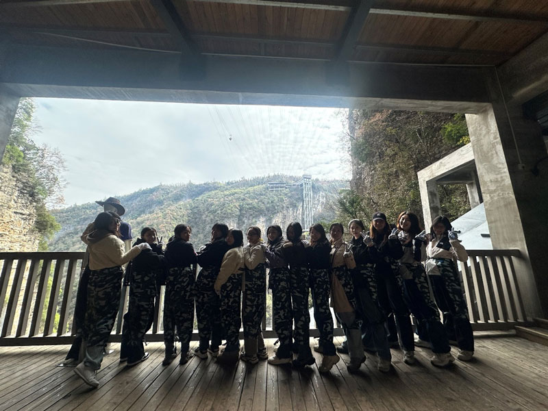首日,團(tuán)隊(duì)乘云駕霧而至張家界。翌日,天門山國家森林公園的玻璃棧道宛如一條銀鏈懸于絕壁,腳下是萬丈深淵,眼前是云海翻涌。此處素有“湘西第一神山”之稱,其砂巖峰林地貌被聯(lián)合國教科文組織列為世界自然遺產(chǎn),堪稱“大自然的鬼斧神工”。有人屏息凝神,有人笑談步步驚心,更有膽大者迎風(fēng)而立。午后,七十二奇樓的《千古情》演出以光影為墨,勾勒出湘西千年的愛恨傳奇,令觀者如癡如醉。